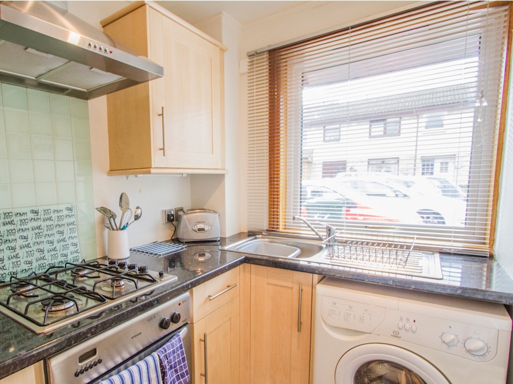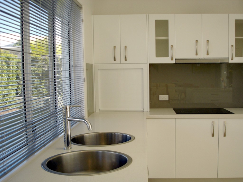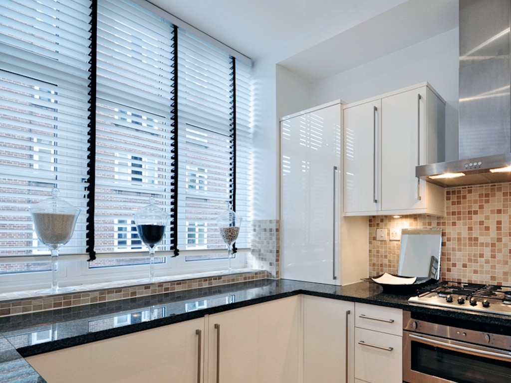 Fiindca in bucatarii e nevoie de deschiderea frecventa a geamului, jaluzelele orizontale din aluminiu fixate direct pe ochiul de geam sunt cea mai practica alegere in acest caz.