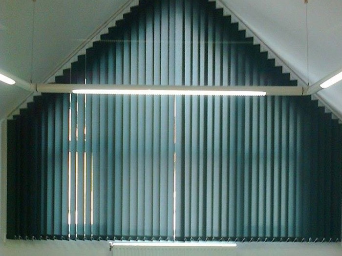 O varianta posibila este folosirea jaluzelelor verticale inclinate, care functioneaza cu garnisa in pozitie inclinata, si are aceleasi functiuni ca si o jaluzea verticala normala, adica lamelele se pot roti si plia catre margini.